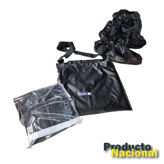 Traje de 2 piezas (Chaqueta y Pantalón) elaborado en material Vinílico o PVC (Poli cloruro de Vinilo) compacto con soporte textil en poliéster, impermeable, resistente al desgaste y fácil de limpiar